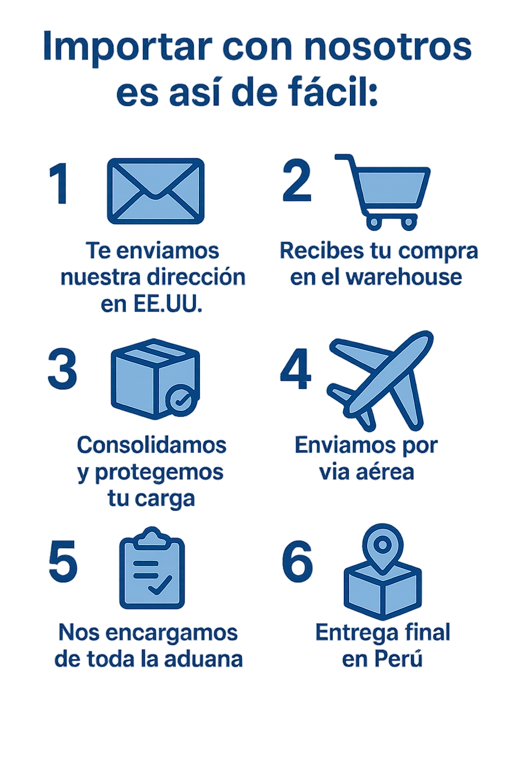 Importar con nosotros es rápido y sencillo. Tú haces la compra en cualquier tienda de EE.UU. y la envías a la dirección de nuestro warehouse. Allí recibimos tus paquetes, los consolidamos y los protegemos para que pagues menos y lleguen seguros. Luego enviamos tu carga por vía aérea, gestionamos toda la aduana por ti y realizamos la entrega final en Perú sin complicaciones. Tú solo compras… nosotros nos encargamos del resto.